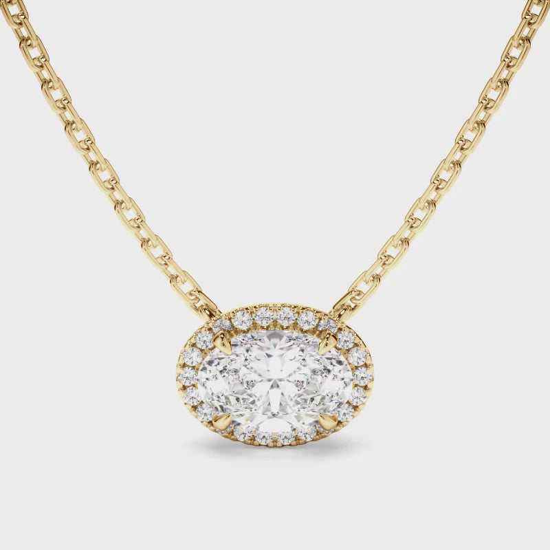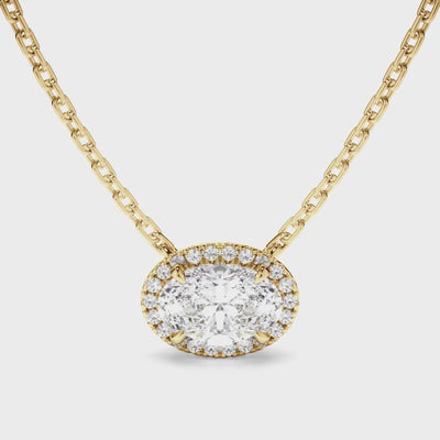 This elegant east west oval cut diamond halo necklet, made with your choice of diamond centre stone, features a minimum 0.10ct round brilliant cut diamond halo and includes a 45cm 18ct gold chain. Exuding fluidity in its line work, and boasting an elegant silhouette, as with all the pieces in our Bespoke Collection, this piece is made especially for you. Pictured here with a 1.00ct Oval Cut Diamond, a final price is determined following your centre stone selection.