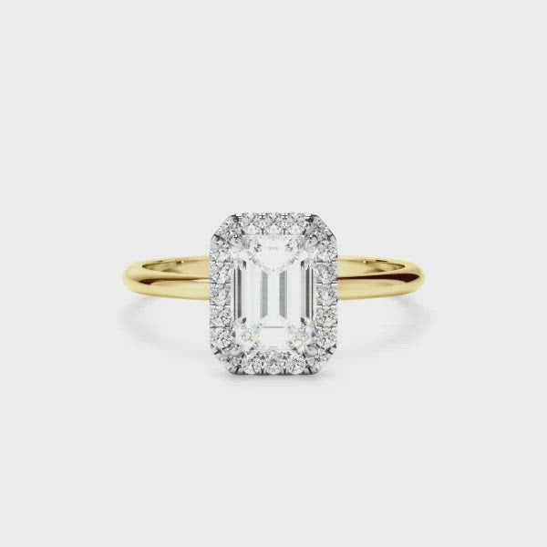 This timeless custom-made engagement ring, made with your choice of diamond centre stone, features an emerald cut diamond adorned in a halo of round brilliant cut diamonds. Exuding fluidity in its line work, and boasting an elegant silhouette, as with all the pieces in our Bespoke Collection, this piece is made especially for you.