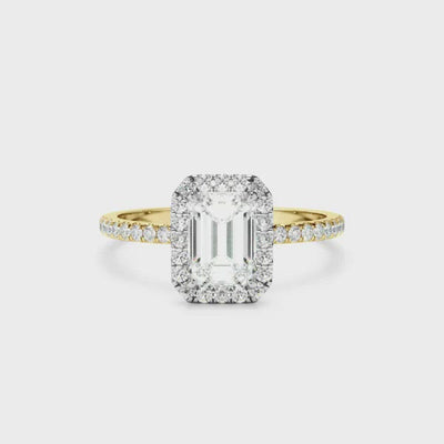 Emerald Cut Diamond Halo Engagement Ring With Pave Band