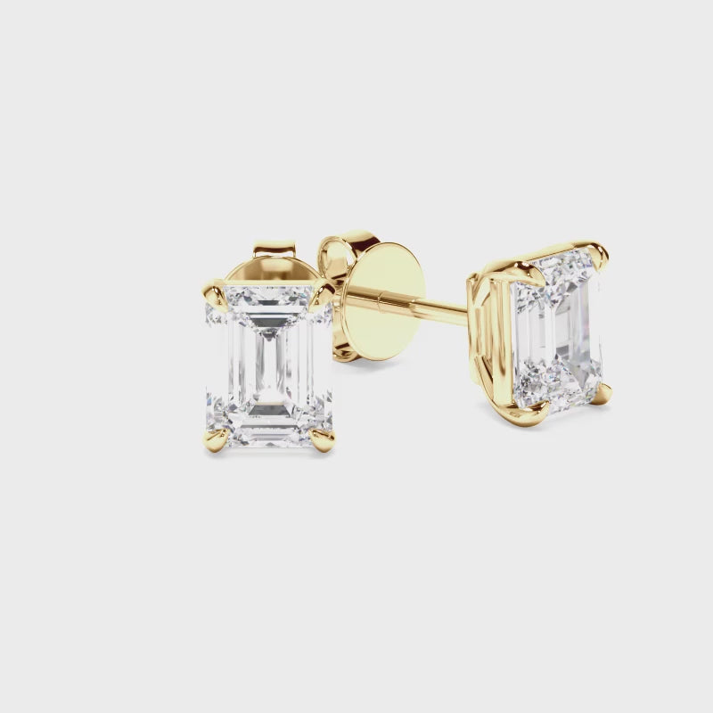 These stunning emerald cut diamond stud earrings, made with your choice of diamond centre stone, feature a classic 4-claw setting and butterfly post. Exuding fluidity in its line work, and boasting an elegant silhouette, as with all the pieces in our Bespoke Collection, this piece is made especially for you. Pictured here with a 1.00ct Emerald Cut Diamond for each ear, the final price is determined following your centre stone selection.