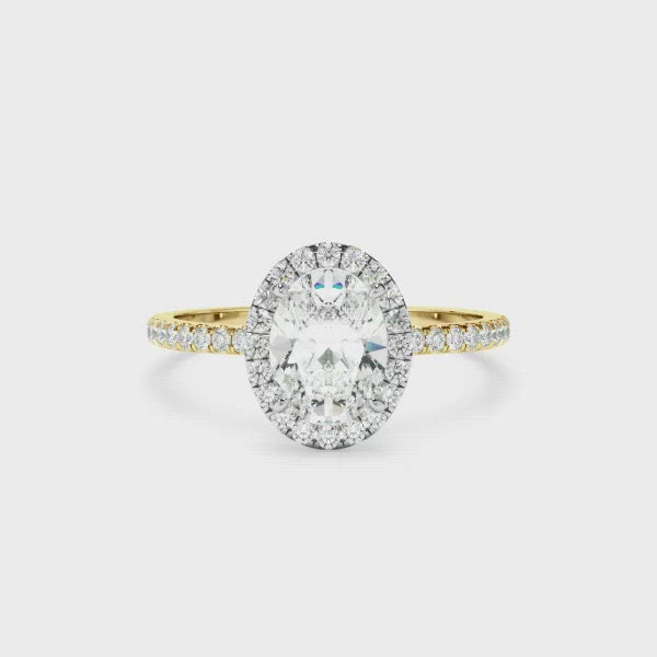 This timeless custom-made oval cut diamond engagement ring, made with your choice of diamond centre stone, features a diamond halo and half band of pave diamonds. Exuding fluidity in its line work, and boasting an elegant silhouette, as with all the pieces in our Bespoke Collection, this piece is made especially for you.